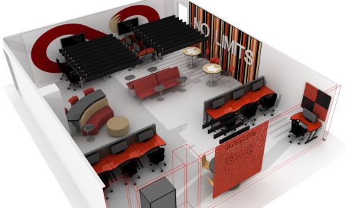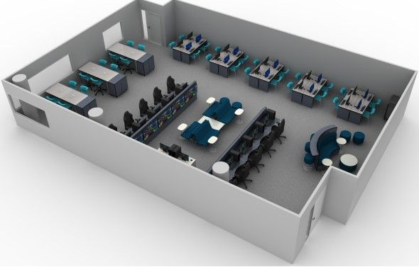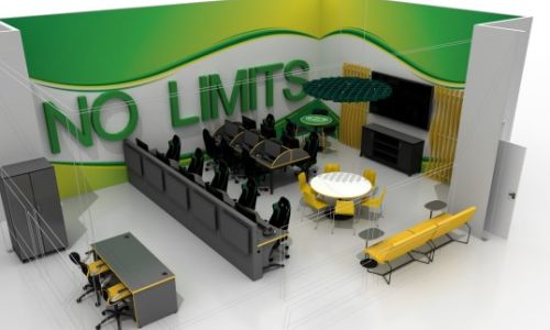 Darlington High School Esports arena that includes a lounge area surrounding the main stage, facilitated spectating with mounted monitors around the player's desks, a coach's office, and a team room.